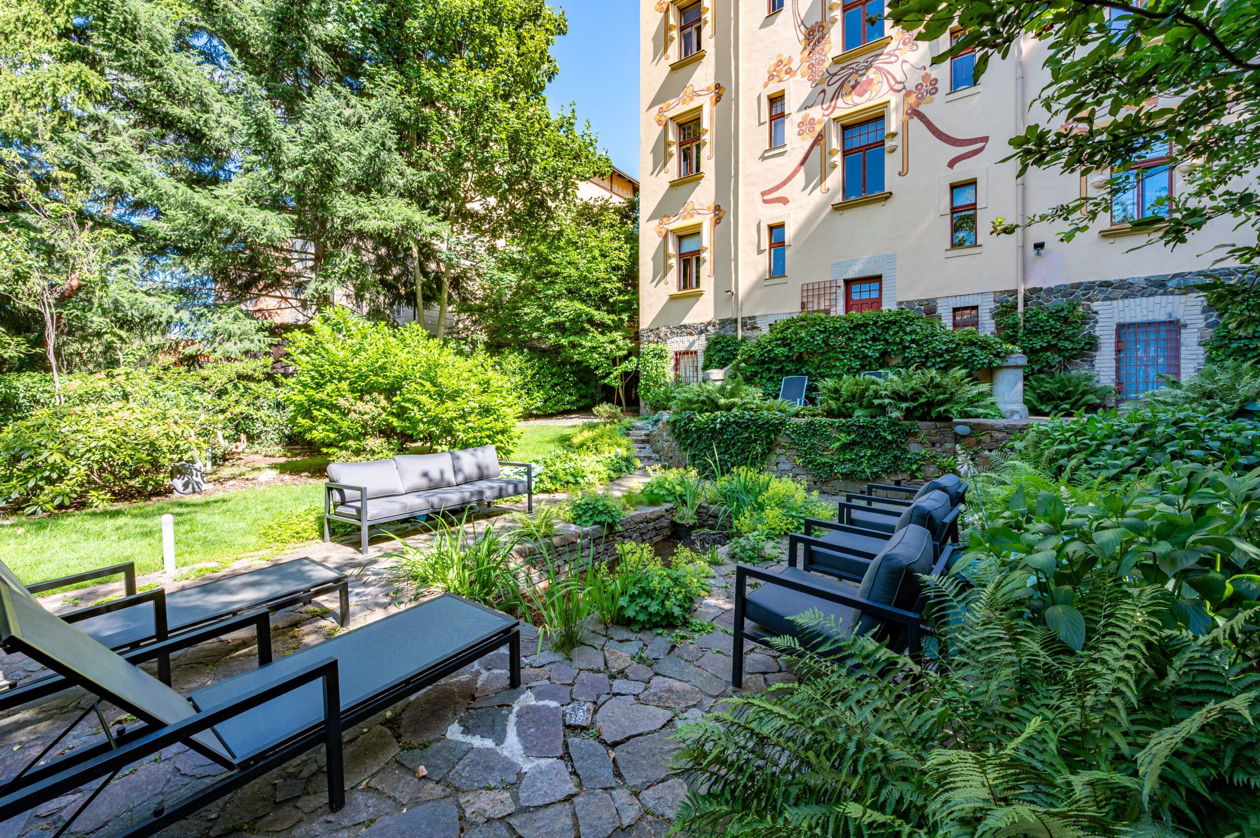 Nestled within a private plot, the villa’s garden offers a serene escape surrounded by mature trees, manicured greenery, and artistic landscaping in harmony with the villa’s Art Nouveau character. Thoughtfully designed for both beauty and privacy, the garden features tranquil seating areas and a decorative water element, creating an ideal setting for quiet reflection or elegant outdoor gatherings.